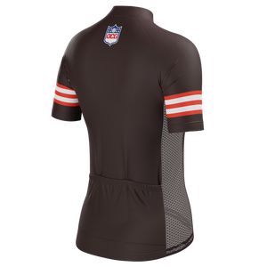 The Women's Cleveland Football Short Sleeve Cycling Jersey features a moisture-wicking LEMBO 140 GSM polyester, cooling 110GSM mesh side panels, and reinforced stitched back pockets.
