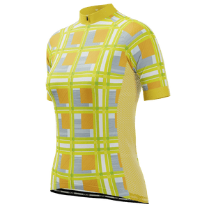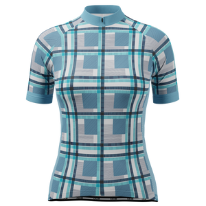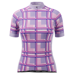 The Women's Criss-Crossed Tartan Short Sleeve Cycling Jersey features a moisture-wicking LEMBO 140 GSM polyester, cooling 110GSM mesh side panels, and reinforced stitched back pockets.