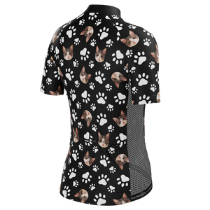 The Women's Custom Pet Paws Design Personalized Short Sleeve Cycling Jersey features a moisture-wicking LEMBO 140 GSM polyester, cooling 110GSM mesh side panels, and reinforced stitched back pockets.