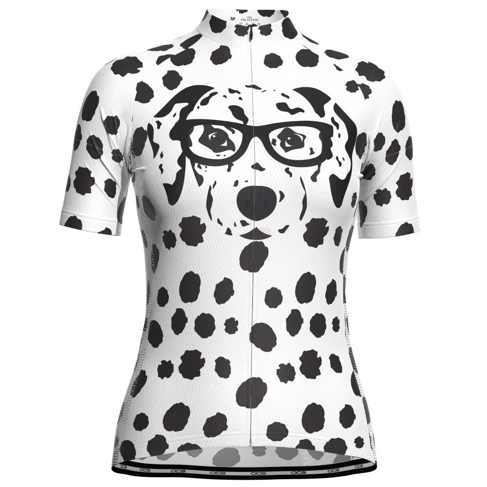 The Women's Dalmatian Dog Short Sleeve Cycling Jersey features a moisture-wicking LEMBO 140 GSM polyester, cooling 110GSM mesh side panels, and reinforced stitched back pockets.