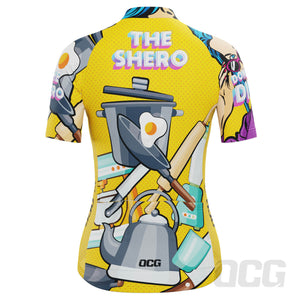 The Women's Domestic Diva The Shero Short Sleeve Cycling Jersey features a moisture-wicking LEMBO 140 GSM polyester, cooling 110GSM mesh side panels, and reinforced stitched back pockets.