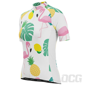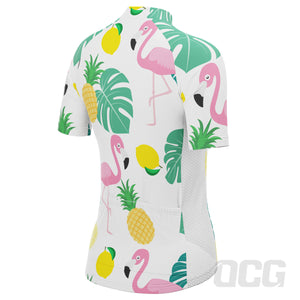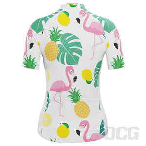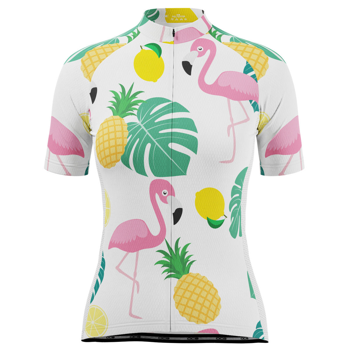 The Women's Fruity Flamingo Short Sleeve Cycling Jersey features a moisture-wicking LEMBO 140 GSM polyester, cooling 110GSM mesh side panels, and reinforced stitched back pockets.