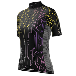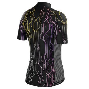 The Women's Holographic Circuit Short Sleeve Cycling Jersey features a moisture-wicking LEMBO 140 GSM polyester, cooling 110GSM mesh side panels, and reinforced stitched back pockets.