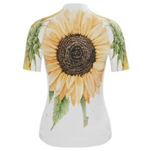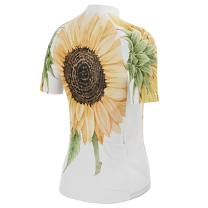 The Women's Illustrated Sunflower Short Sleeve Cycling Jersey features a moisture-wicking LEMBO 140 GSM polyester, cooling 110GSM mesh side panels, and reinforced stitched back pockets.