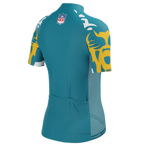 The Women's Jacksonville Football Short Sleeve Cycling Jersey features a moisture-wicking LEMBO 140 GSM polyester, cooling 110GSM mesh side panels, and reinforced stitched back pockets.