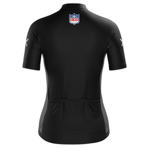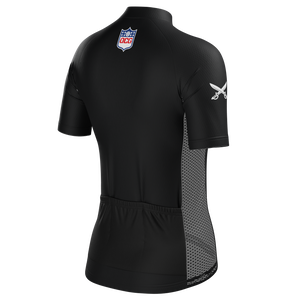 The Women's Las Vegas Football Short Sleeve Cycling Jersey features a moisture-wicking LEMBO 140 GSM polyester, cooling 110GSM mesh side panels, and reinforced stitched back pockets.