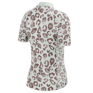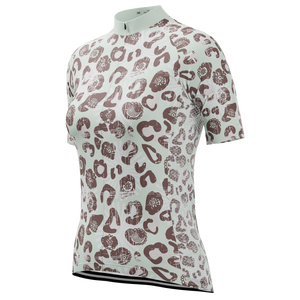 The Women's Leopard Skin Green Gel Padded Cycling Jersey features a moisture-wicking LEMBO 140 GSM polyester, cooling 110GSM mesh side panels, and reinforced stitched back pockets.