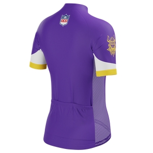 The Women's Minnesota Football Short Sleeve Cycling Jersey features a moisture-wicking LEMBO 140 GSM polyester, cooling 110GSM mesh side panels, and reinforced stitched back pockets.