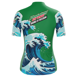 The Women's Pedaling Crew - Riding Is Freedom Short Sleeve Cycling Jersey features a moisture-wicking LEMBO 140 GSM polyester, cooling 110GSM mesh side panels, and reinforced stitched back pockets.