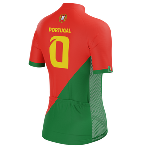 The Women's Portugal Soccer Short Sleeve Cycling Jersey features a moisture-wicking LEMBO 140 GSM polyester, cooling 110GSM mesh side panels, and reinforced stitched back pockets.
