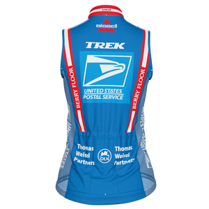 The Women's Retro US Postal Sleeveless Cycling Jersey features a moisture-wicking LEMBO 140 GSM polyester, cooling 110GSM mesh side panels, and reinforced stitched back pockets.