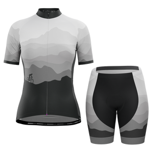 The Women's Ride Free Sunset Short Sleeve Cycling Kit features a moisture-wicking LEMBO 140 GSM polyester jersey body, cooling 110GSM mesh side panels, and reinforced stitched back pockets.