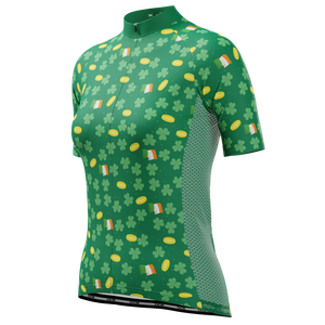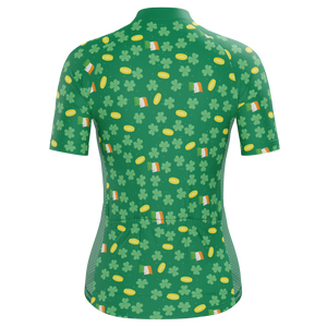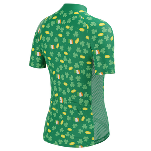 The Women's Saint Patrick's Coins Short Sleeve Cycling Jersey features a moisture-wicking LEMBO 140 GSM polyester, cooling 110GSM mesh side panels, and reinforced stitched back pockets.