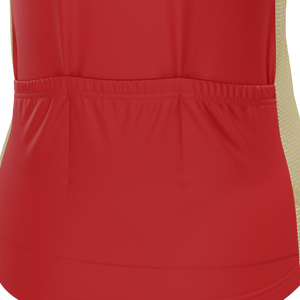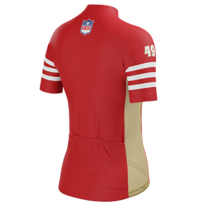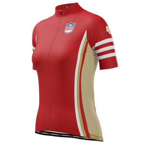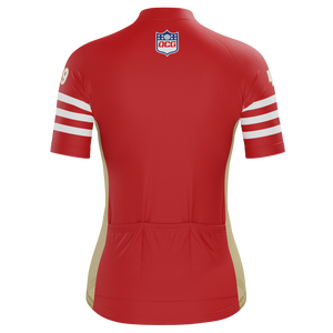 The Women's San Francisco Football Short Sleeve Cycling Jersey features a moisture-wicking LEMBO 140 GSM polyester, cooling 110GSM mesh side panels, and reinforced stitched back pockets.