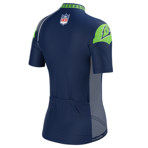 The Women's Seattle Football Short Sleeve Cycling Jersey features a moisture-wicking LEMBO 140 GSM polyester, cooling 110GSM mesh side panels, and reinforced stitched back pockets.
